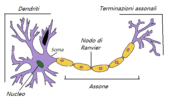 Innanzitutto abbiamo un soma (o corpo cellulare) che è la cella dove il neurone ha i suoi nutrienti e le sue funzionalità primarie. Questa è l’area dove il neurone con una propria coscienza biochimica genera i vari segnali e impulsi per il sistema nervoso. Successivamente parte del neurone è l’assone, che si puo descrivere come una corda snella che è il conduttore dei segnali che partono dal corpo cellulare del neurone e arrivano ai dentriti.