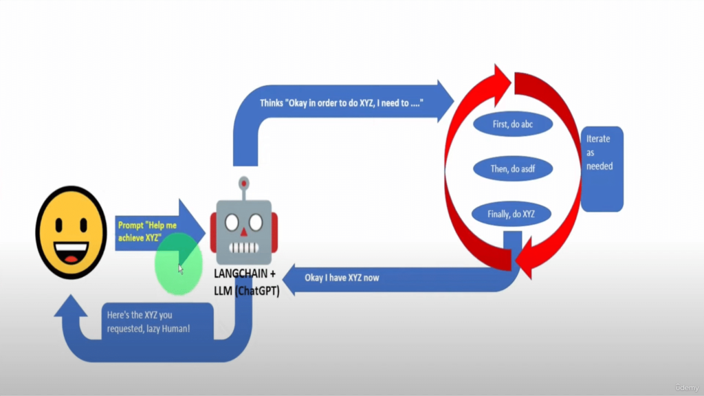 Gli Agent sono molto più di un semplice collegamento tra il framework e risorse esterne. Utilizzano il Large Language Model (LLM) per comprendere l’obiettivo assegnato dall’utente, organizzano una lista di passaggi necessari e possiedono la capacità di eseguire tali passaggi. Queste azioni includono la gestione di chiamate API esterne, l’accesso a database, l’esecuzione di sotto-task e la restituzione delle risposte.