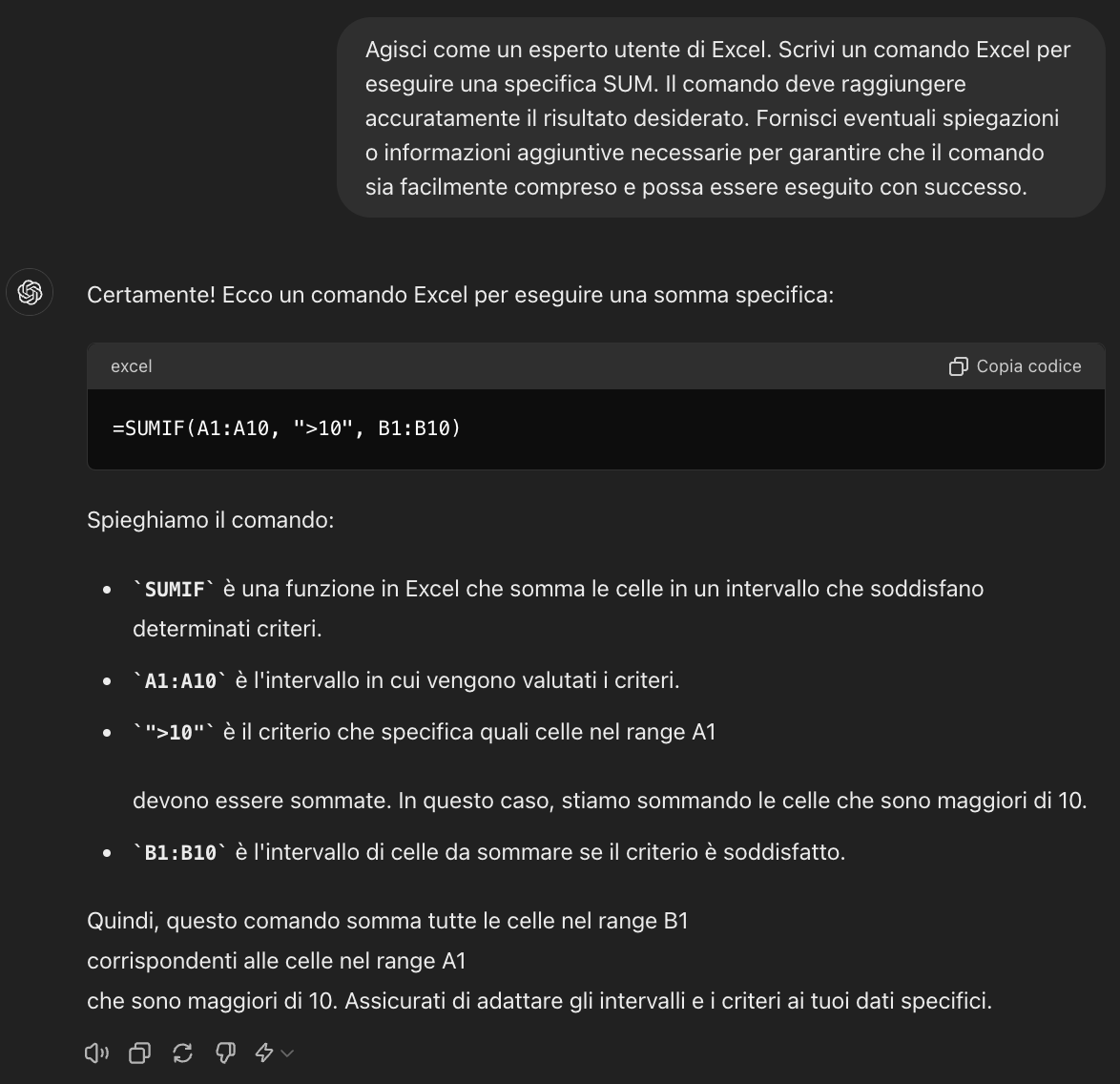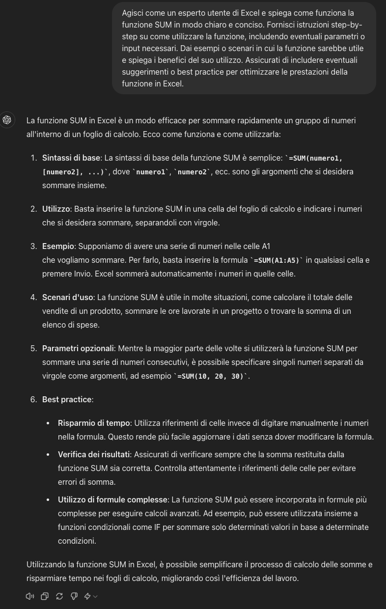 Nel seguente caso, si è utilizzato il prompt template precedente per spiegare la funzione SUM.