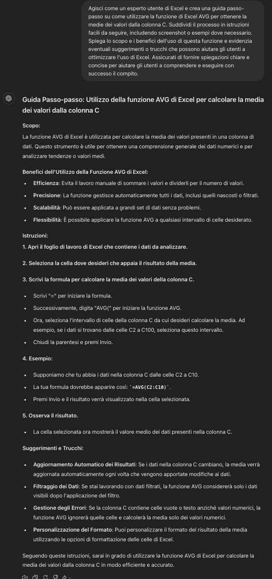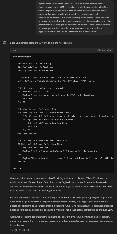 In conclusione, l’integrazione di ChatGPT con Excel può trasformare radicalmente il modo in cui gestiamo e utilizziamo i fogli di calcolo. Grazie ai prompt specifici che abbiamo esplorato, è possibile sfruttare l’intelligenza artificiale per spiegare funzioni complesse, scrivere comandi, creare macro e svolgere compiti avanzati con facilità e precisione. Questa sinergia non solo migliora l’efficienza operativa, ma rende anche Excel più accessibile e user-friendly per utenti di tutti i livelli di competenza.