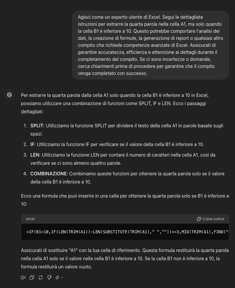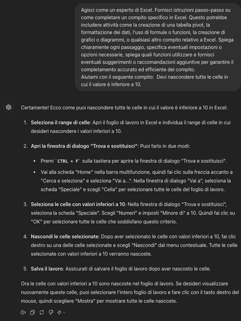 Il modo migliore è avere un unico prompt che trasformi ChatGPT in un assistente per Excel che può aiutarti con qualsiasi compito.